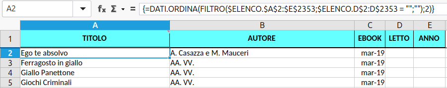 LETTI (Ordinati per autore). Formula matriciale in A2: