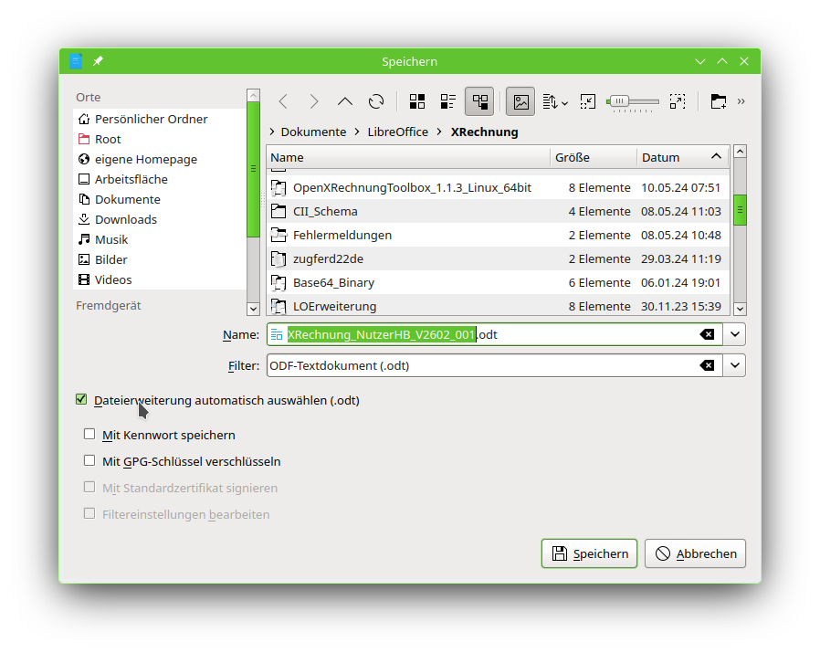 Ich rufe ein bereits gespeichertes Textdokument auf, ändere paar Textzeilen und möchte dann mit speichern unter einen neuen Speichernamen vergeben. Sobald ich dieses neue Dokument wieder aufrufen möchte, sehe ich das die Dateiendung nicht mehr odt heisst sondern : 26-Datei und lässt sich nicht mehr öffnen.
