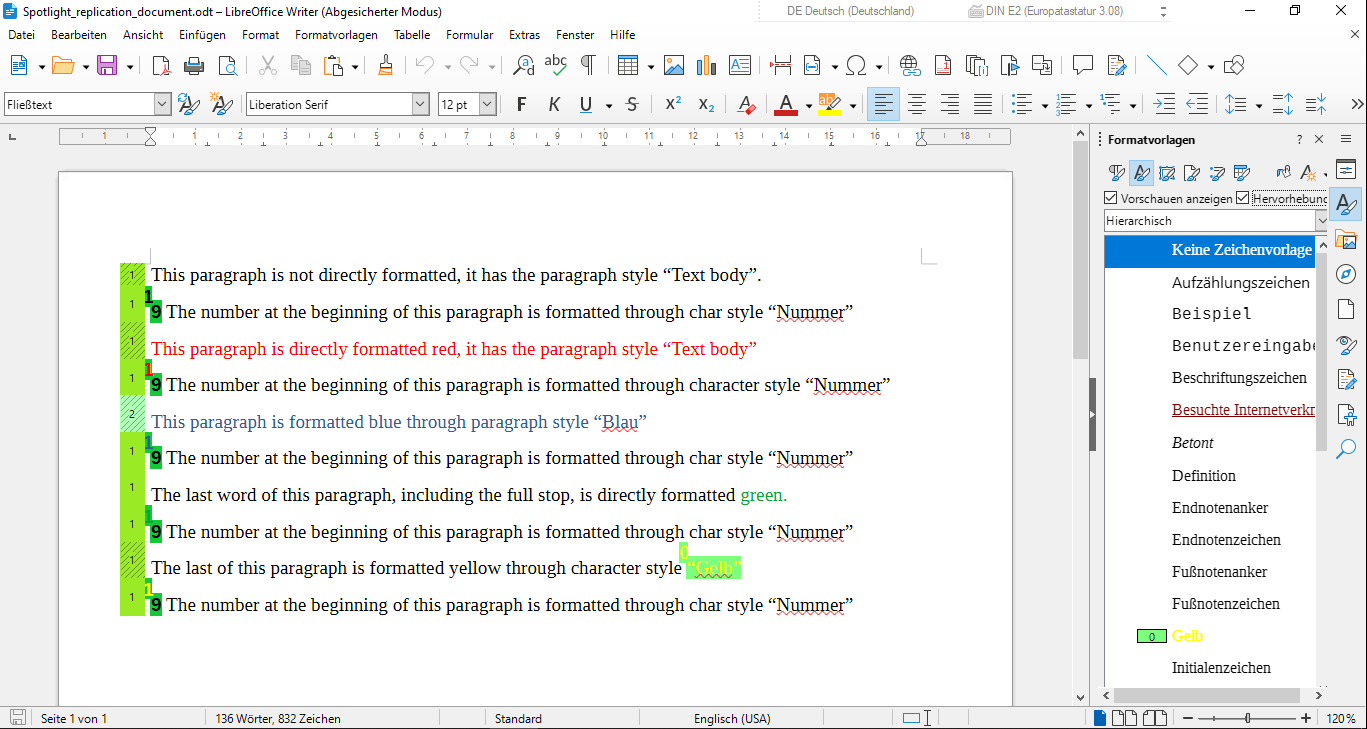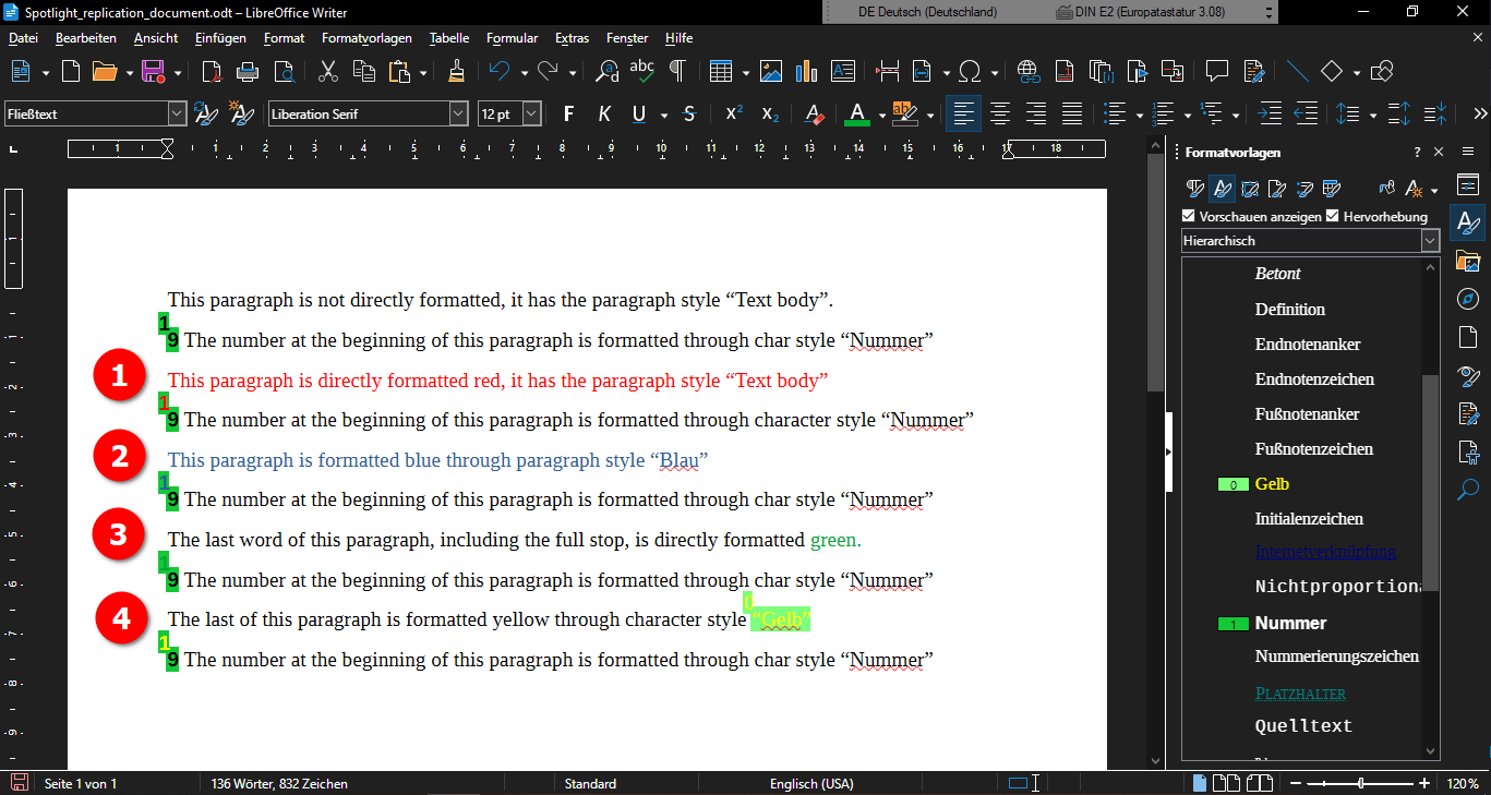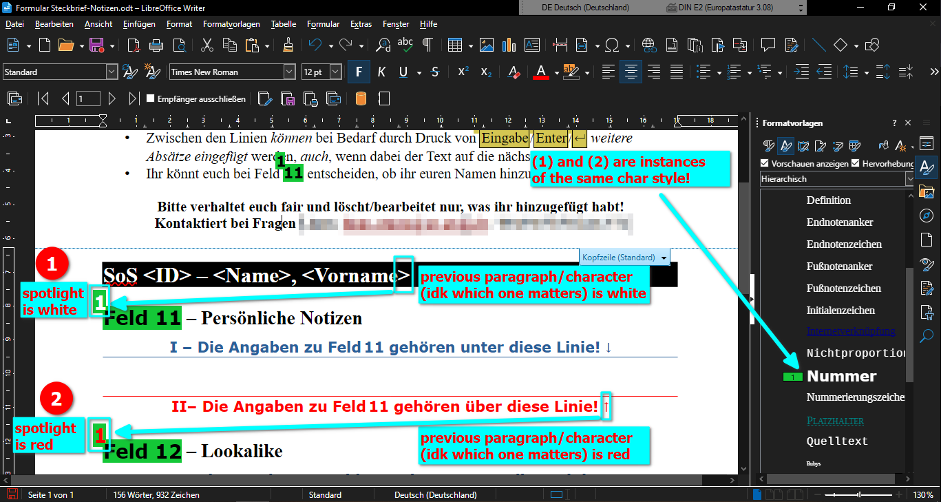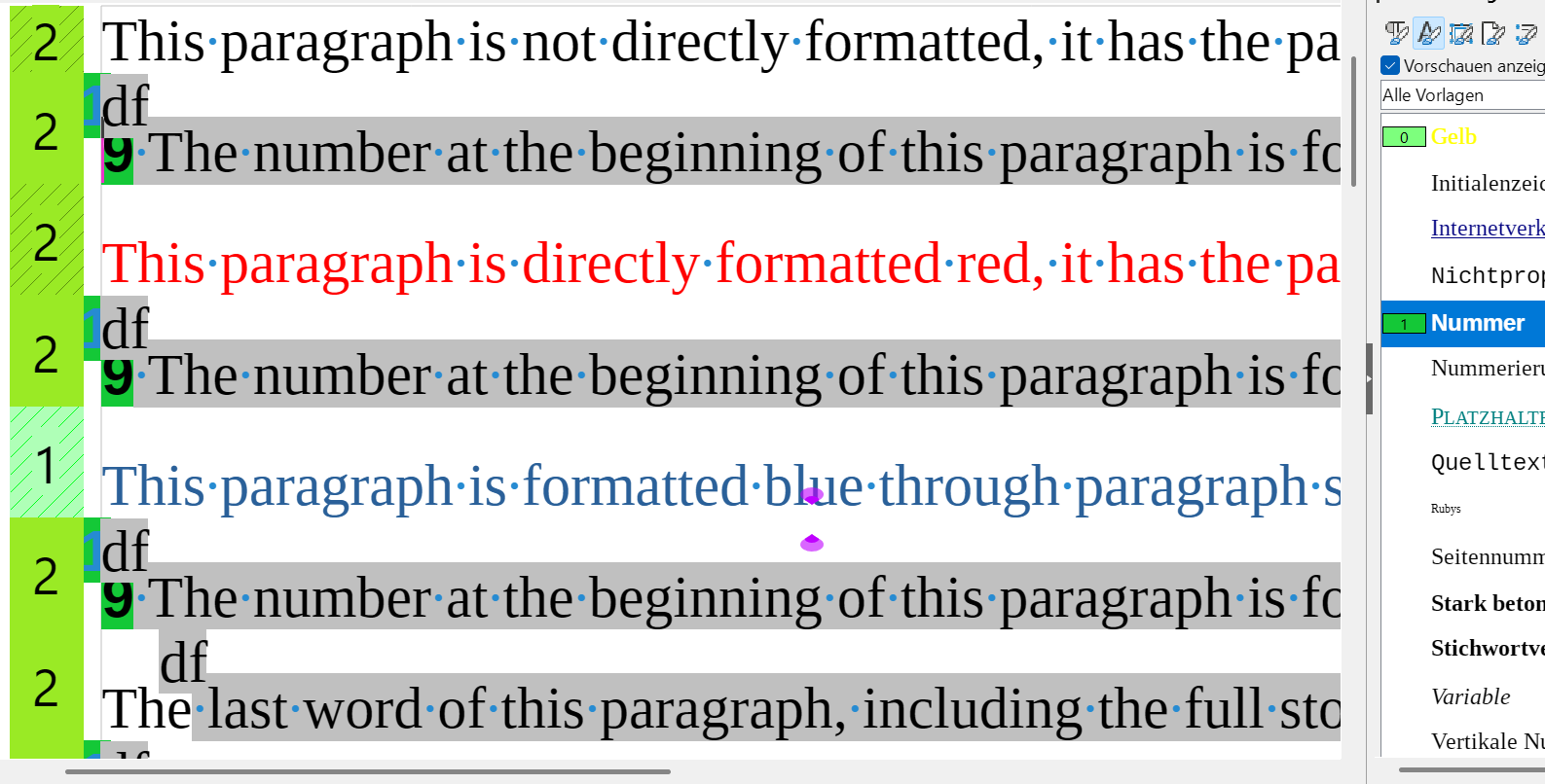I just noticed something peculiar when working with styles in LO writer. After having turned on spotlight (G. “Hervorherbung”) in the styles panel, I wondered why, of two instances of the spotlight marker for the character style “Nummer”, one was white, while the other was black. The text was colored in black in both cases.
