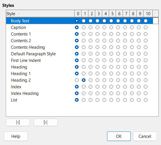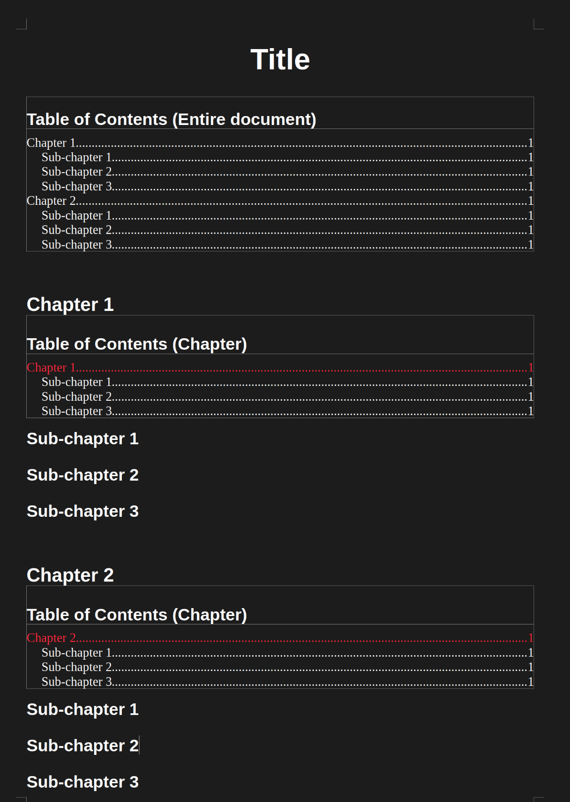 - On the 1st page of every Chapter: Table of Content (For: Chapter) up to levels 5.