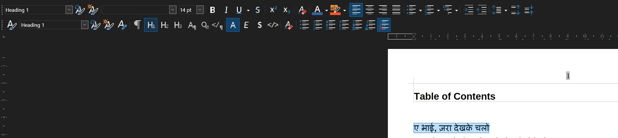 I have just gone through a small collection of song lyrics and meticulously applied “Heading 1” to each title line. Then at the top of the document, I inserted a Table of Contents. The screenshot shows what I got. What am I doing wrong?