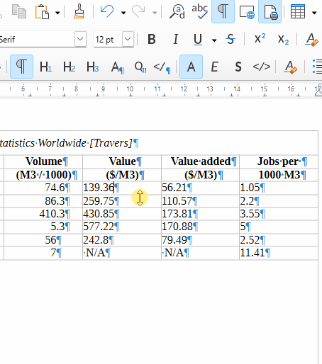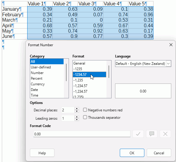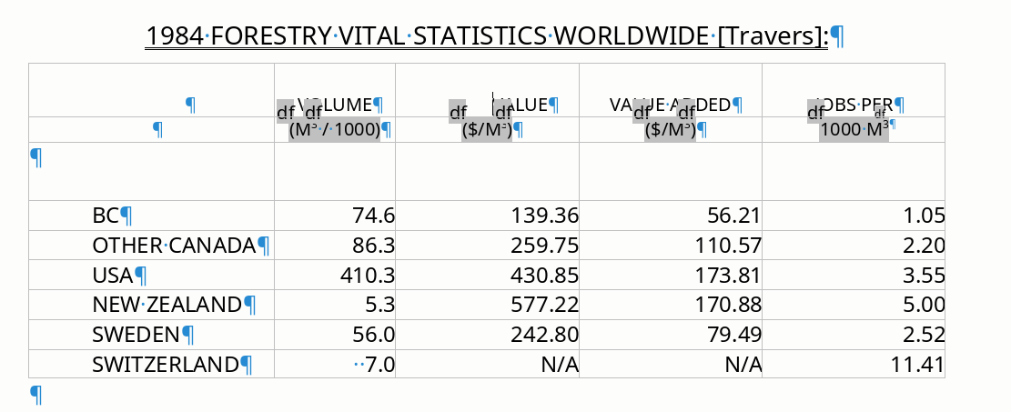 … my first effort a creating a proper table. Looks ok, but can I get decimal alignment and also get the numbers to center in the column? Back with WP I’d just pad with spaces to center things by eye, but LO won’t accept padding, it seems. And centering doesn’t look good.