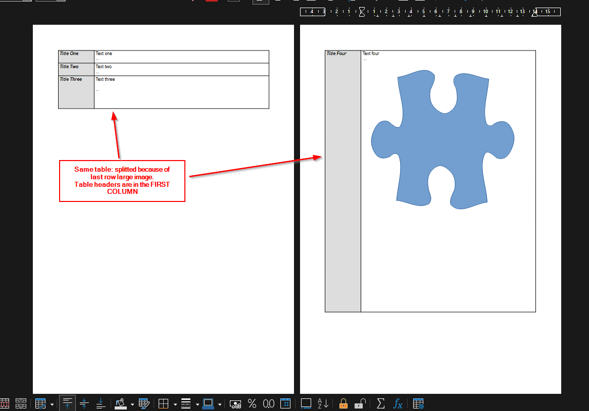 Then, if I fiddle with Table properties, and I mean simply enabling/disabling in ‘Text flow’ to ‘Allow table to split’ and ‘Allow row to break’ a few times, back and forth, I end up with the following result: