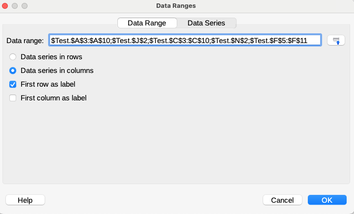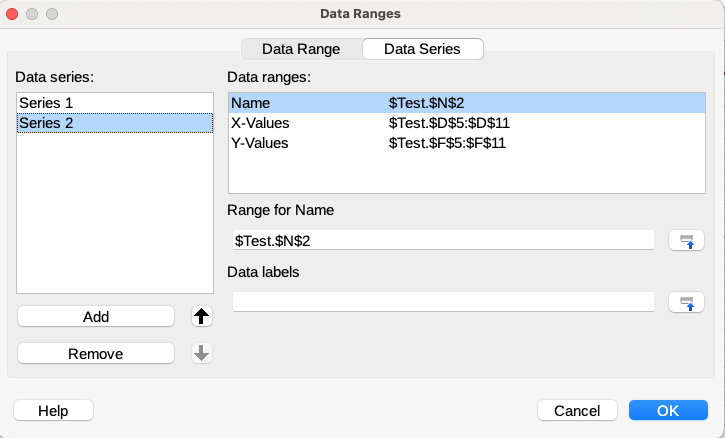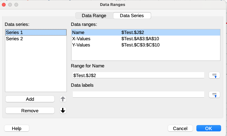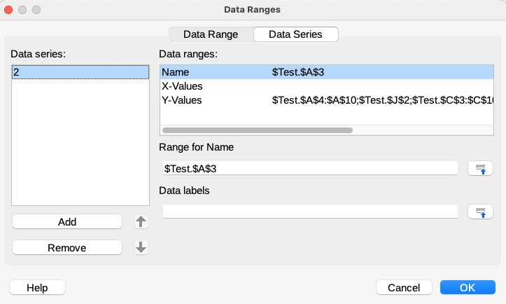 The disappointment came later: When the ODS file is closed and reopened, the names of the ranges in the “Data Series” in the Chart Wizard are replaced by the addresses (X1Data is replaced by $Test.$A$4:$A$10, etc.).