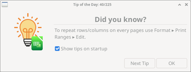 I didn’t know about the Guide, thanks. Also, opening to a random page in the Calc Guide could be a good alternative to curated yet random Tip-of-the-Day (not that you were suggesting random-page)