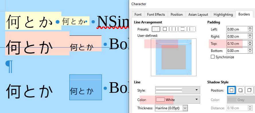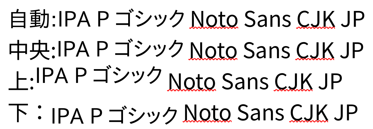 LibreOffice Writerで段落の行の位置を中央揃えに設定しているのですが、文字の上部に空白ができてしまうからなのか、中央に揃いません。