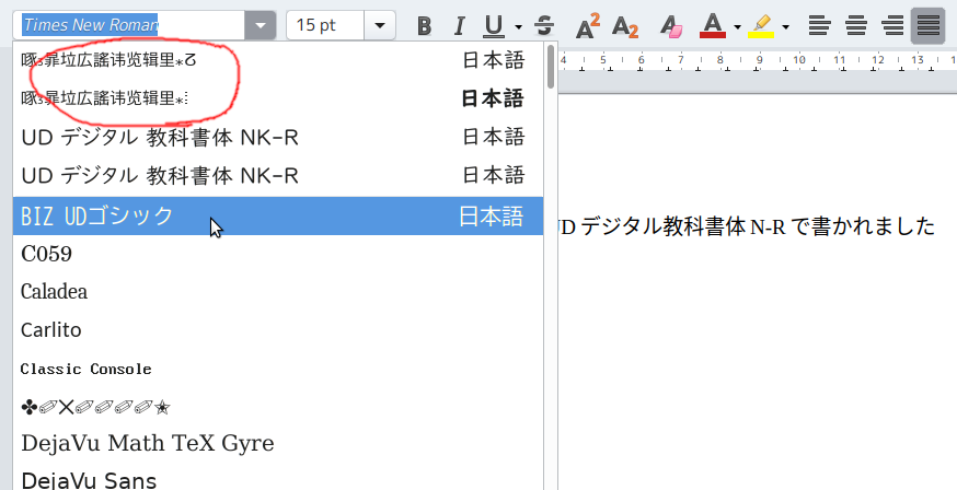 いろいろ確認してみたところ、「UDデジタル教科書体N-R」を使ったドキュメントのみがエラーを起こしており、またLibreOfficeのフォントセレクタから見ると「UDデジタル教科書体N-R」「UDデジタル教科書体N-R Bold」の2つが文字化けしていました(画像参照)。