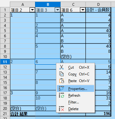 calcを使用し、会員名簿を作成しカテゴリー毎の集計を行うためピボットテーブルを作成しました。