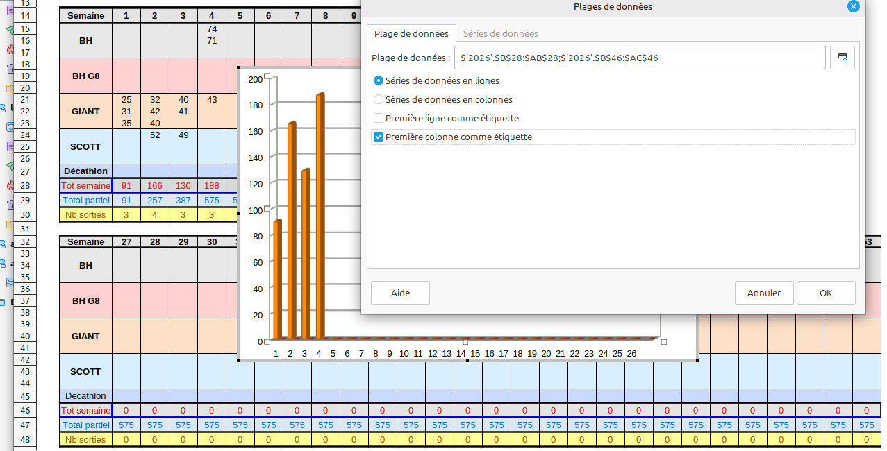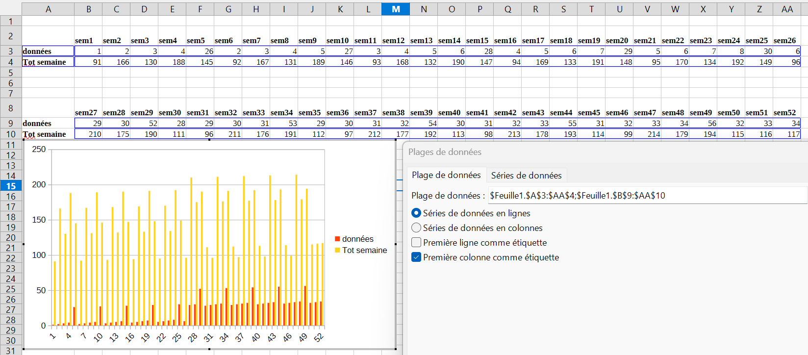 Je voudrai que le diagramme - type colonne - me présente les 26 cellules de la dernière ligne des deux tableaux concécutivement, donc de 1 à 52 représentant l’année.