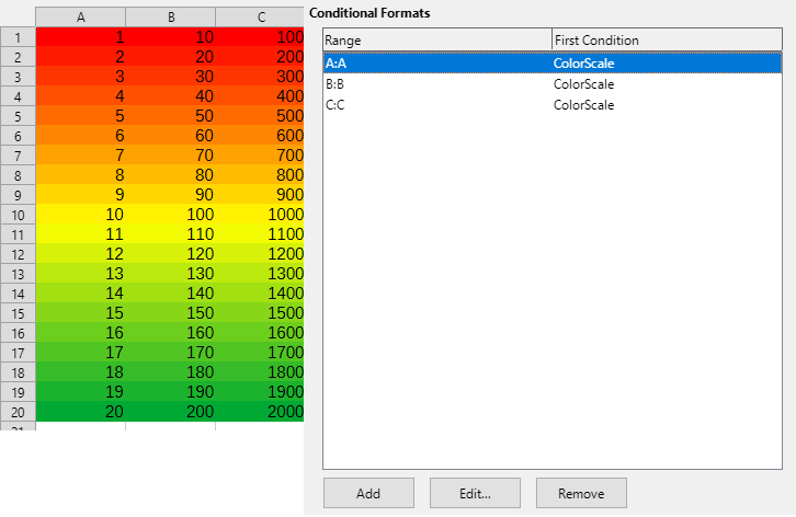 I had a spreadsheet with conditional formats on individual columns. When I open the .xlsx file with the latest version of Calc some of the formats are collapsed down to one range: