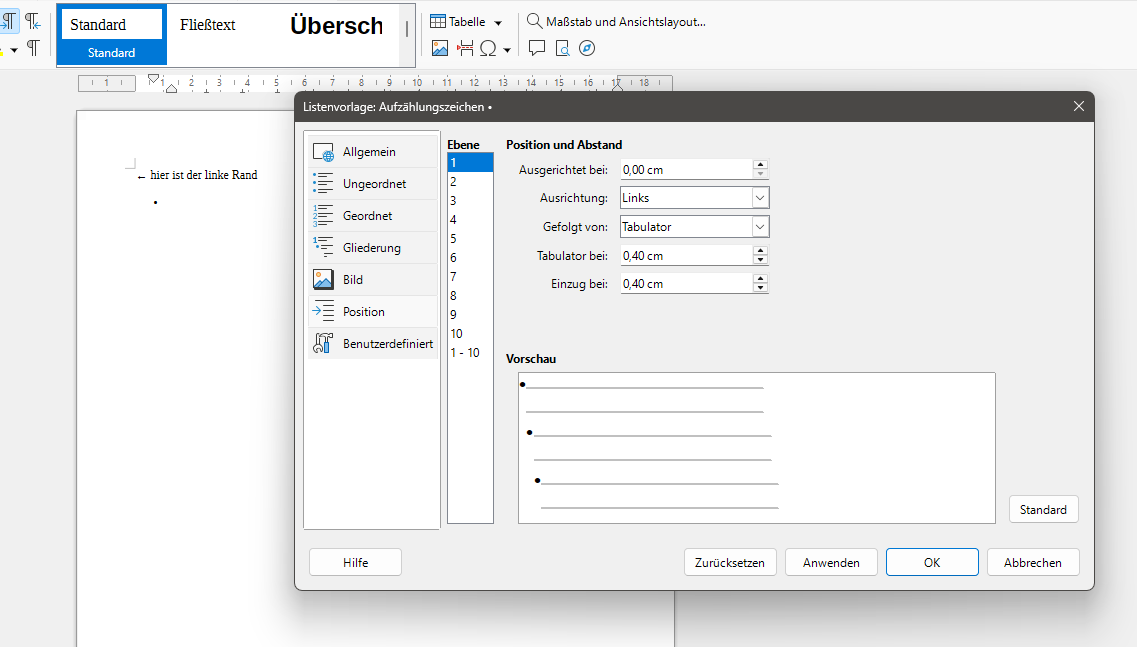 Bei Microsoft Word ist genau die gleiche nervige Grundeinstellung, aber da kann ich einfach schnell Drag & Drop benutzen, um den Listenpunkt / das Aufzählungszeichen an die Stelle bei 0,00 cm zu ziehen. Das geht also einfach viel schneller und stört meine Produktivität nicht. Daher möchte ich gerne wissen: