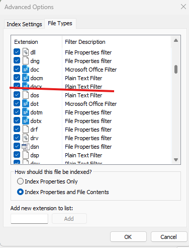 In windows 11 indexing options → Advanced options - File types The docx file type is using a plain text filter which means I can’t search my docx documents created by Libre office. I have spent HOURS searching how to change this and the only suggestion I’ve found is to “reinstall office 365” I am using Libre office, so this suggestion is a non-starter. Help?