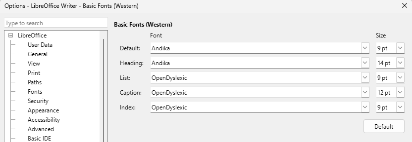 I have an easier time reading 9 pt Andika than 12 point Liberation Serif. Your mileage may vary. I would rather have a single readability font straight through, or similar-looking fonts like Andika and Skeirs, than mix them with OpenDyslexic. Unfortunately, Opendyslexic and Roboto fonts don’t support all the scripts/charsets I use, and for me, Liberation and Noto fonts aren’t as readable as any of the above.