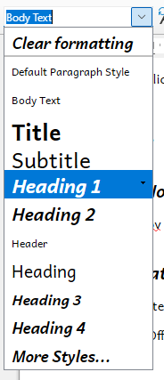 If I try to create a new file in LibreOffice on Windows, the styles are a mess. Instead I copy a file from my Mac, and replace the contents, so I can use the styles from my Mac. But the styles are still a mess: