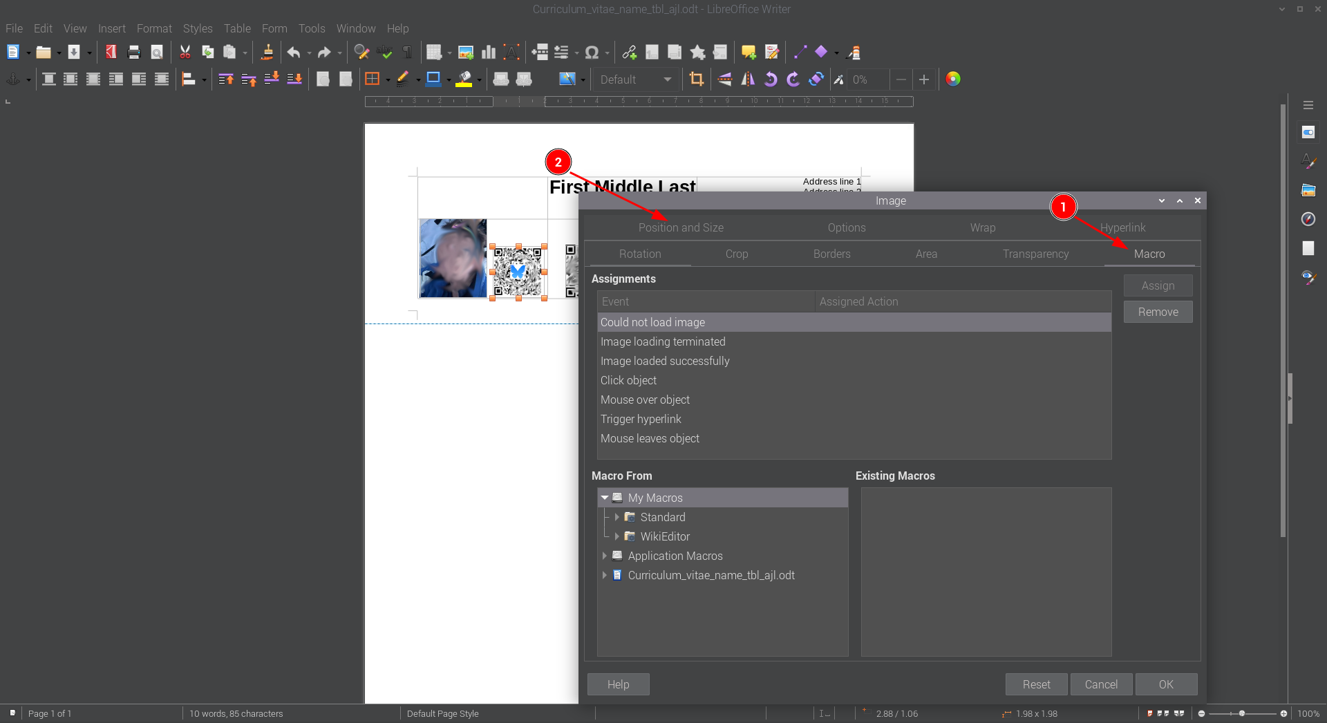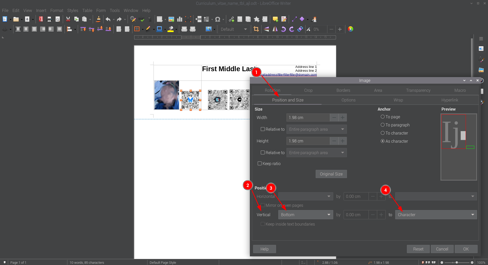 I checked all images/frames in Curriculum_vitae_name_tbl_ajl.odt and the sizes are all different and not a consistent 2x2cm. Q7 Does this mean the formula style is not applying on my version of LibreOffice Writer 7.4.7.2?