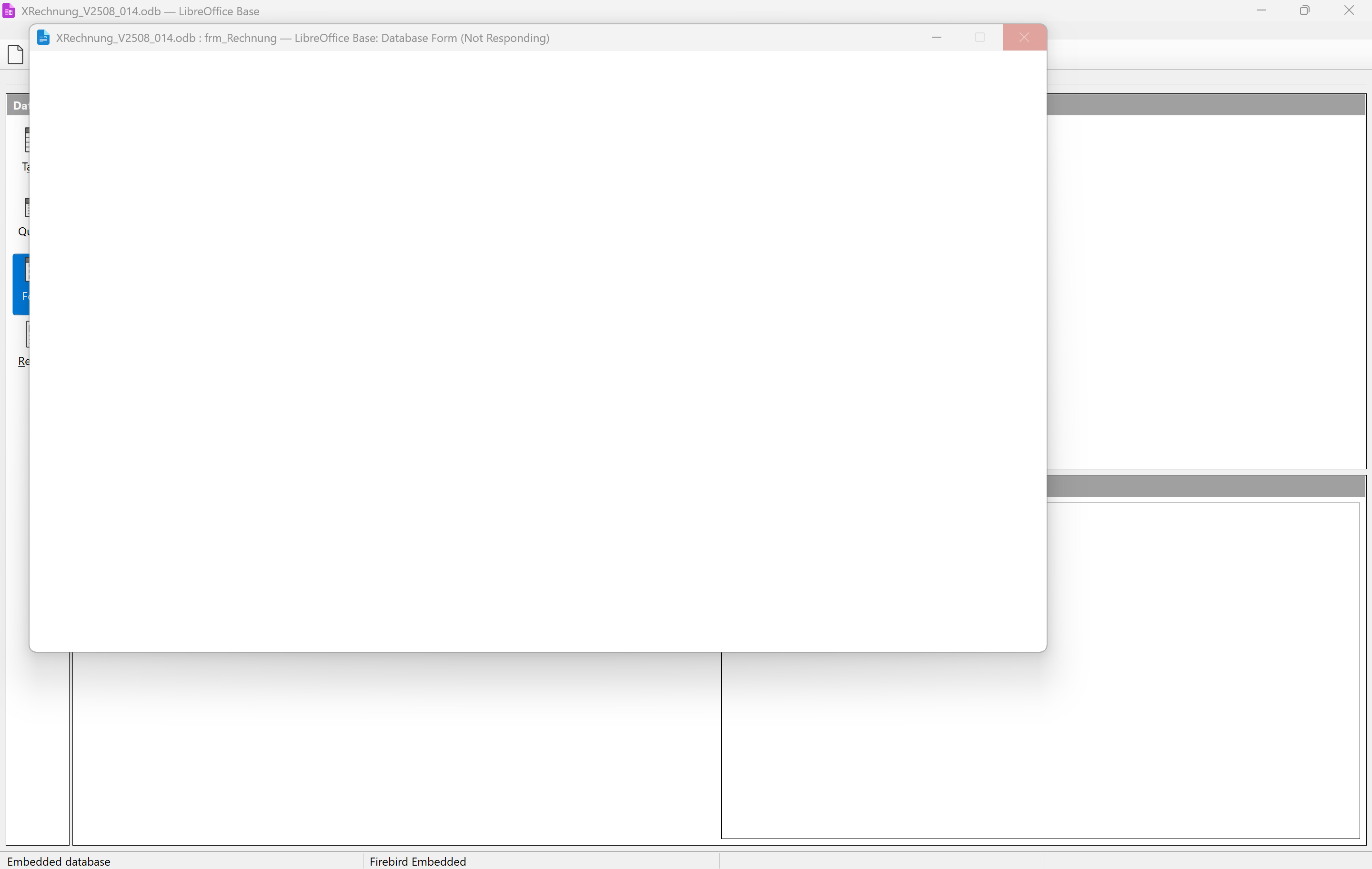 ich verwende die XRechnung Erweiterung in Libre Office. Leider bleibt die Datenbank hängen, wenn ich versuche diese mit V25.8.3 zu laden. Das Formular Fenster öffnet sich aber alles bleibt weiß und es erscheint die Meldung Fenster Reagiert nicht mehr.