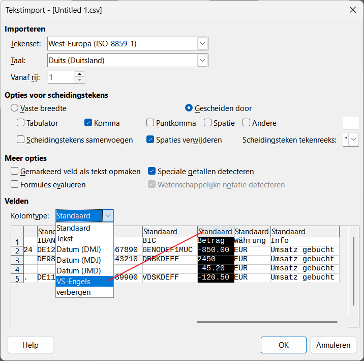 mijn bankgegevens komen al jaren in een .csv-bestand met getallen (bedragen) met punt-notatie (-> 35.15). Na import en conversie naar Calc vervang ik met Zoeken en Vervangen de punt door een komma (35,15), om valuta-opmaak mogelijk te maken (€ 35,15). Vandaag lukte dat niet: zoek punt/vervang door komma maakte van elk getal 4 punten (…). Hetzelfde bij vervangen van minteken (-) door niets, om positieve getallen te krijgen.